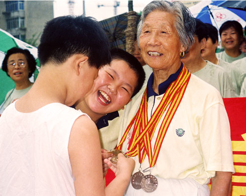 2007年5月,第九届全国老将田径运动会在杭州举行,5000米长跑赛场上,时年89岁的如皋运动员施秀英是参赛年龄最高的选手。只见她满头银发,步履矫健,一路领先。赛场上的人们都向她投以敬佩的目光,一次次为她拍手叫好,一个个为她鼓劲加油。施秀英不负众望,最先冲过终点线,夺得该项的金牌。众多媒体记者采访,运动员、裁判员祝贺,纷纷与她合影留念。在这次运动会上,她还获得1500米长跑第三名。其实,早在1998年,施秀英就参加了在北京举行的首届全国老将田径运动会。当时,她81岁,是参赛者年龄最大的女运动员,在1500米长跑比赛中夺得银牌。从此,运动会上经常见到她的身影,屡创佳绩,摘金夺银。1999年,北京第二届老将田径运动会上,她仍然是年龄最大的女运动员,一鸣惊人地勇夺5000米、800米两块金牌和1500米银牌,并获得最高龄女运动员特别奖。