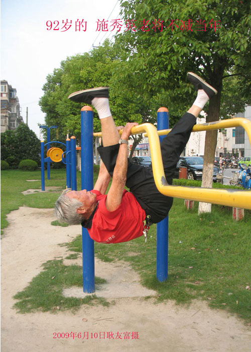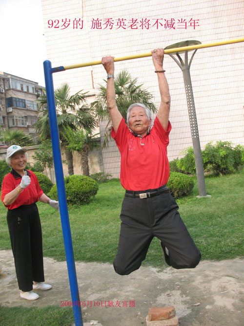 施秀英是一名普通的修鞋女工,本与体育运动无缘。曾与1976年因切除胸腔肿瘤被拿掉两根肋骨。病后,她开始坚持锻炼,数十年如一日。她自创了一套床上按摩操,起床前先全身上下按摩一遍,然后就外出跑步,不论冷风刺骨的寒冬,还是烈日酷暑的炎夏,哪怕是大年初一,都从不间断,如城的大街小巷留下她深深的脚印,留下了她串串汗水,为了增大肺活量,跑步时她都要朗声高喊“一二三四”的口令。奇迹在不停的步伐和“一二三四”的口令中发生了:病愈后的身体逐步康复,体质一天天增强,以后伤风感冒,几乎不沾她的身。谁能想到80岁的老人血压通常保持在120/80mmHg左右,心电图一切正常,跑上十几公里,轻松自如。她还练就了不少绝活:双手十指撑地的俯卧撑一气能做十多个,双臂屈伸引体向上能拉十多下,还能双腿挂在单杠上头朝下做倒身垂悬,大劈叉的动作也照样能做。现已经94岁高龄,却身板硬朗,耳聪目明,看上去绝不像耄耋之年的老人。
