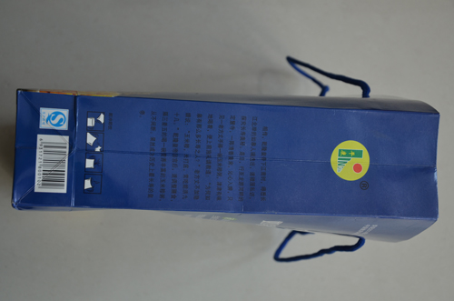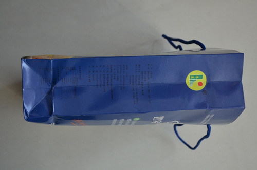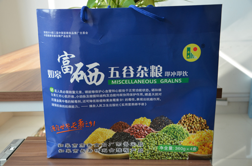 (1)拎袋:矩形天蓝色铜版纸,既硬质可靠,又富有天然色彩,亲切、自然、可信。正面天蓝底色上方,中有所荣获的“中国健康保健富硒产品”金奖照片,右上角注有黄色“平康”产品商标。正面主体--艺术化的产品名称,蓝底勾白、十分醒目。名称下有相关硒元素对人体食疗作用的介绍,简短明了。正面天蓝底色下方,有特色提醒展示的--“源自世界长寿之乡”的富硒五谷杂粮原料,既爽心悦目,又真实可信。背面天蓝底色印有“玉米糁米打底,常喝能活九十几”的神话传说,揭示了源远流长的如皋富硒“五谷杂粮”的“长寿密码”。